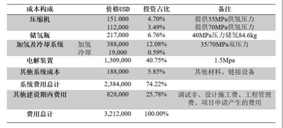 電解水制氫成本主要是電的成本,每立方氫氣生產(chǎn)需要消耗5度電左右。盡管部分站內(nèi)電解水制氫加氫站會采取氫光互補的戰(zhàn)略,然而依然離不開市電。國內(nèi)火電占市電的比例達到70%,意味著制出來的氫氣大部分屬于灰氫。這也意味著,制取每公斤氫氣的成本將達到60元左右。其投建成本包括建設費用、制氫設備(電解裝置)、氫氣純化、壓縮設備(壓縮機)、儲氫設備(儲氫瓶)和加氫設備(加氫及冷卻系統(tǒng))等幾大方面的成本支出,成本構(gòu)成如下: