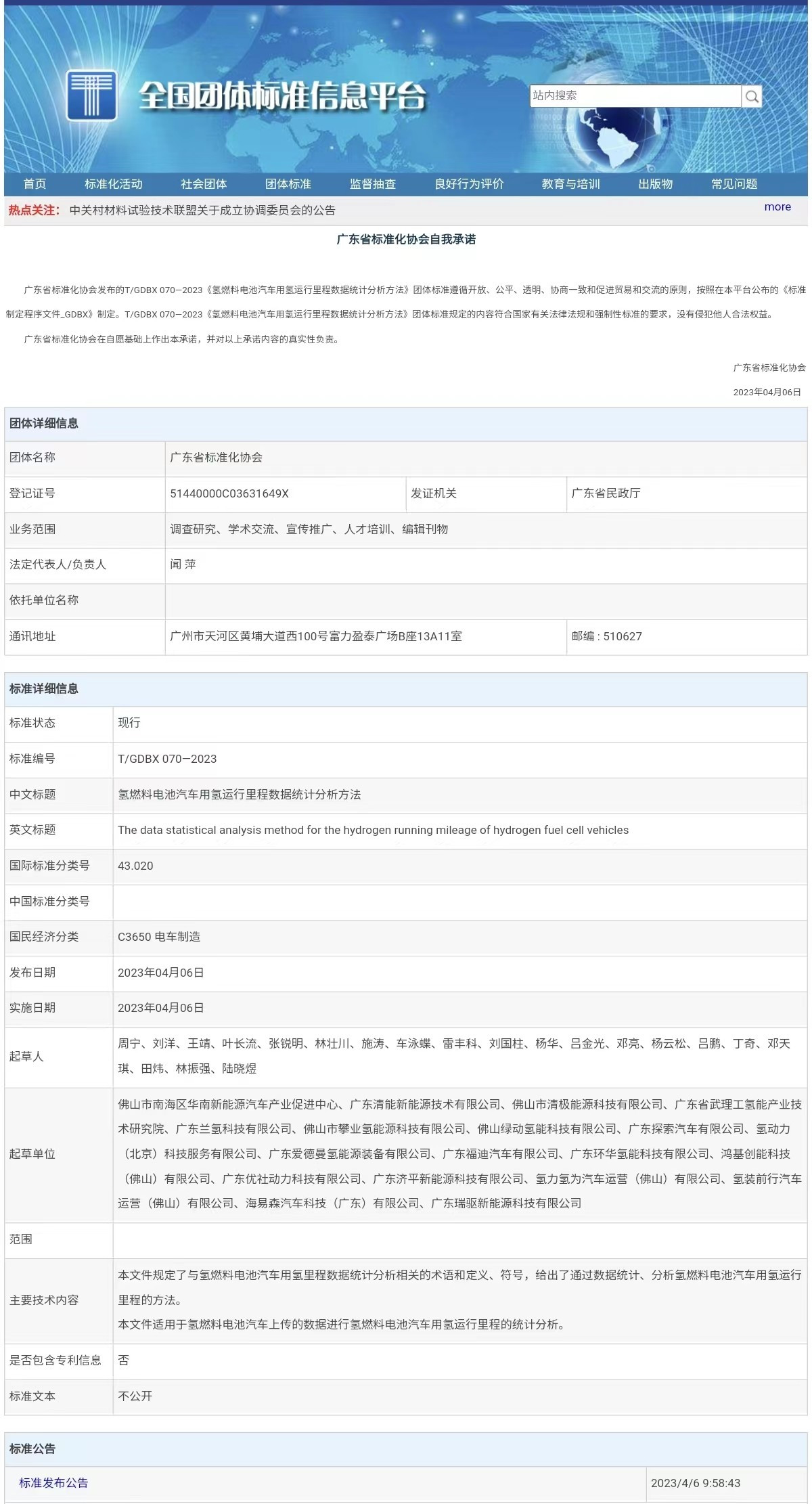 On April 6th, the group standard of Statistical Analysis Method for Hydrogen Fuel Cell Vehicles (T / GDBX 070- -2023) (referred to as "Standard"), led by South China New Energy Vehicle Industry Promotion Center, Nanhai District, Foshan City, was officially released!